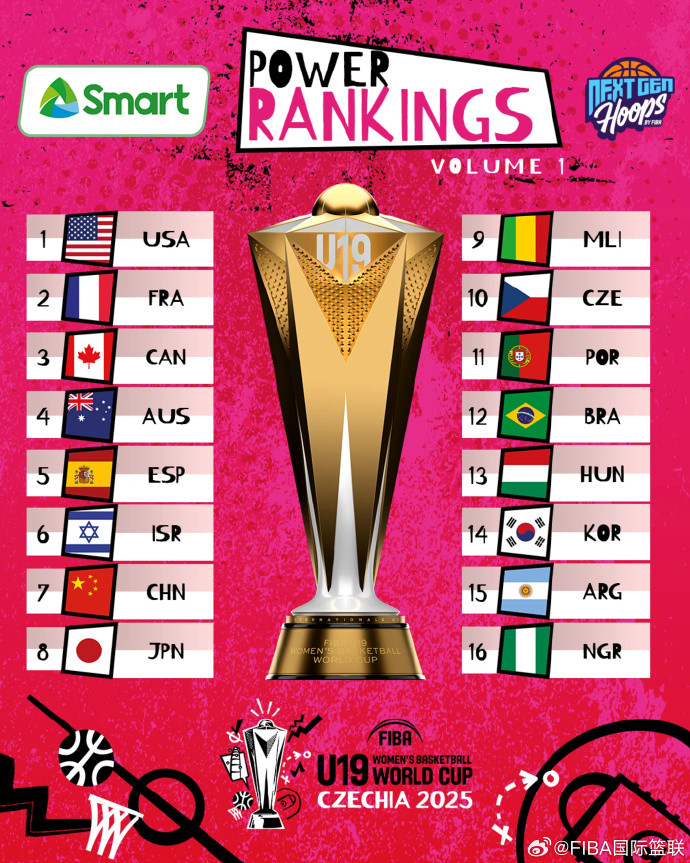 FIBA国际篮联官方公布了FIBAU19女篮世界杯实力榜,美国女篮稳居第一位,紧随其后的是法国女篮、加拿大女篮,中国女篮排在第7位。