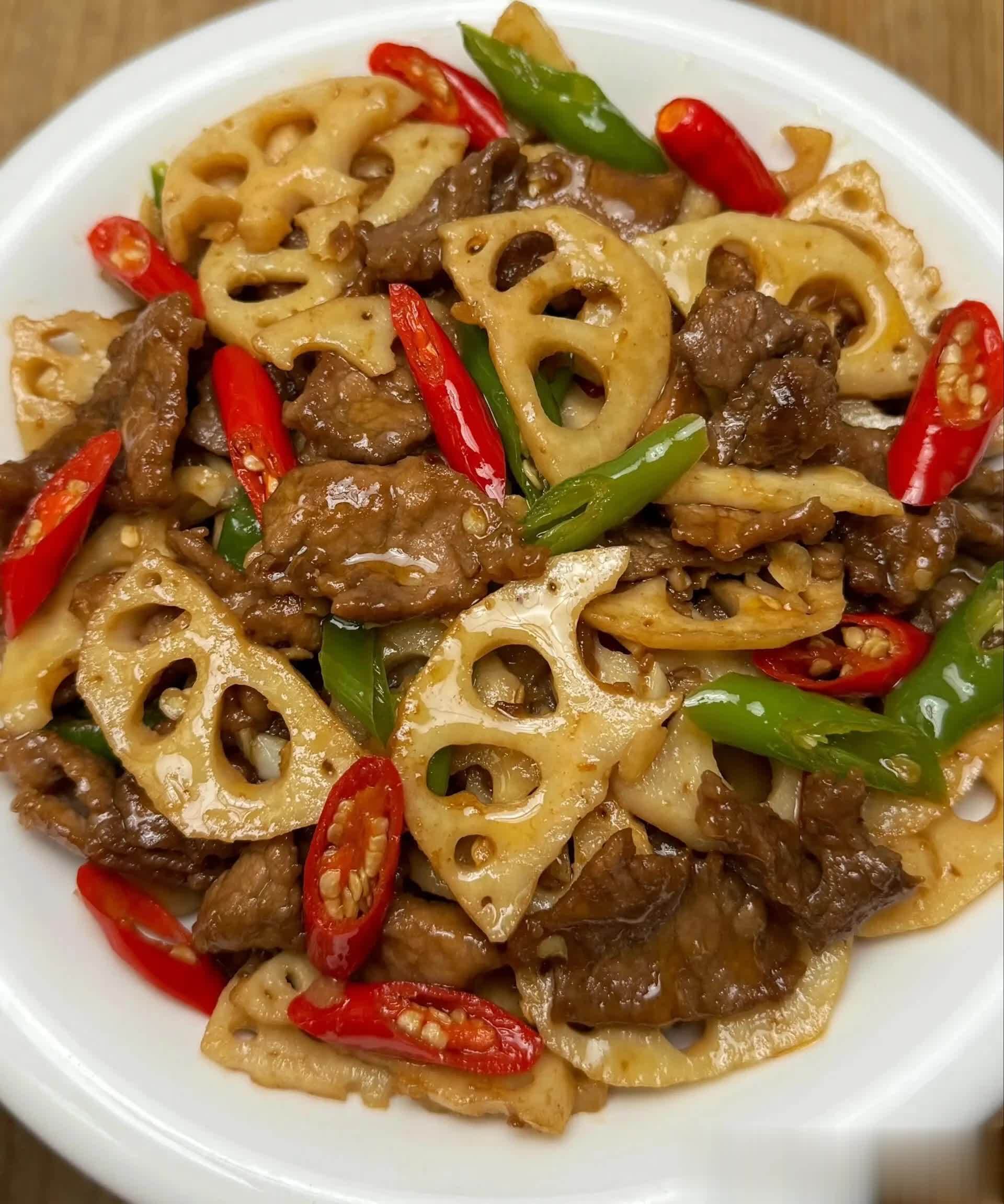 7. 炒蔬菜:加入焯水后的莲藕片和红椒丝,翻炒均匀,加入适量盐、生抽调味,继续翻炒2-3分钟,确保所有食材熟透。
