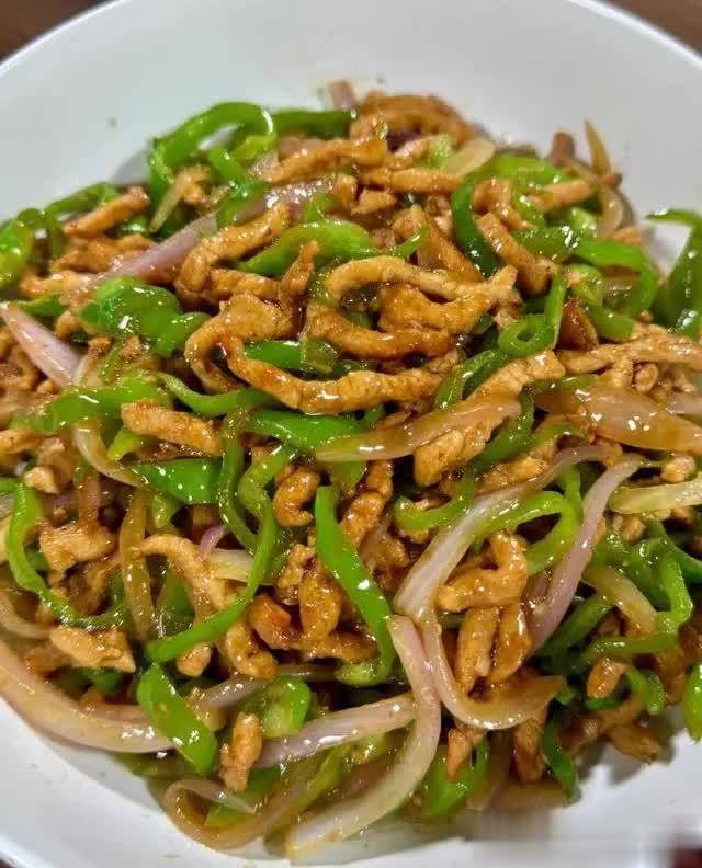 2、热锅热油,大火把肉丝炒熟盛出,锅留底油下入洋葱、青椒丝翻炒至断生,再倒入肉丝,加一勺生抽,适量的鸡精翻炒入味即可。